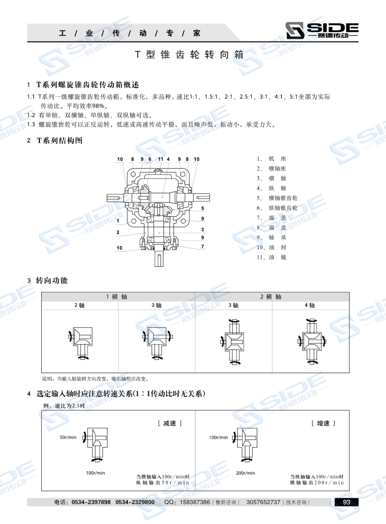 1、T系列螺旋傘齒輪轉向箱,標準化,多品種, 速比全部為實際傳動比。平均效率達98% 。